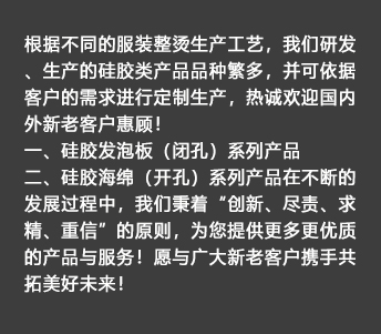 我公司生產(chǎn)的硅膠海綿(開孔)系列產(chǎn)品具有耐高溫、透氣性好、耐壓性強(qiáng)等優(yōu)點,是西服及高檔服裝整燙生產(chǎn)的必備產(chǎn)品。硅膠發(fā)泡板(閉孔)系列產(chǎn)品具有發(fā)泡均勻,耐高溫、耐壓性能好,其中新研制開發(fā)的針孔浮點硅膠發(fā)泡板攻克了一般產(chǎn)品的浮點不飽滿的技術(shù)難題,一般產(chǎn)品的浮點不飽滿,容易擋住透氣孔,造成吸風(fēng)效果不良。我司的產(chǎn)品具有更好的透氣性和回彈性,以及更長時間的試用壽命。